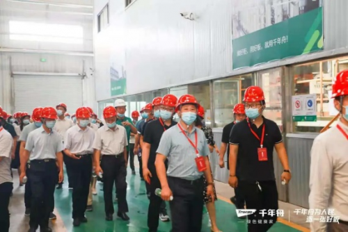 佩戴完口罩和安全帽等相關防護措施后,現場人員一同步入工廠參觀。在千年舟集團副總裁田茂華的帶領下,大家近距離參觀了千年舟澳思柏恩日照工廠刨花板生產線、配套設施及倉庫等,將工廠的現代化、智能化和環保化展露無遺。