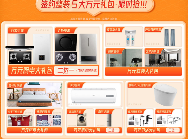 99周年慶活動期間,滬尚茗居聯合眾多品牌家居推出5大萬元裝修禮包,將廚電、軟裝、床品、家電、衛浴各類裝修建材一網打盡。老板、方太、摩恩、海爾、金可兒...多個品牌家居聯手讓利,優惠大放送,將寵粉進行到底。