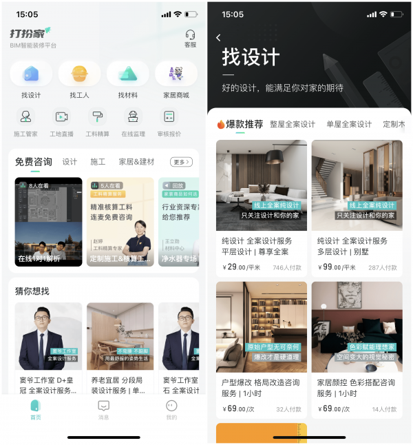 首先以直接找工人的業(yè)務(wù)將消費者吸引到平臺上,這是打扮家引流的第一利器。隨后是不帶貨的線上好設(shè)計,進一步優(yōu)化競爭力。硬裝之后,平臺還可以通過BIM提供家電、家具,甚至精確到插板的材料清單,又和軟裝供應鏈串聯(lián)起來。環(huán)環(huán)相扣的服務(wù),為吸引流量、留住流量發(fā)揮作用。