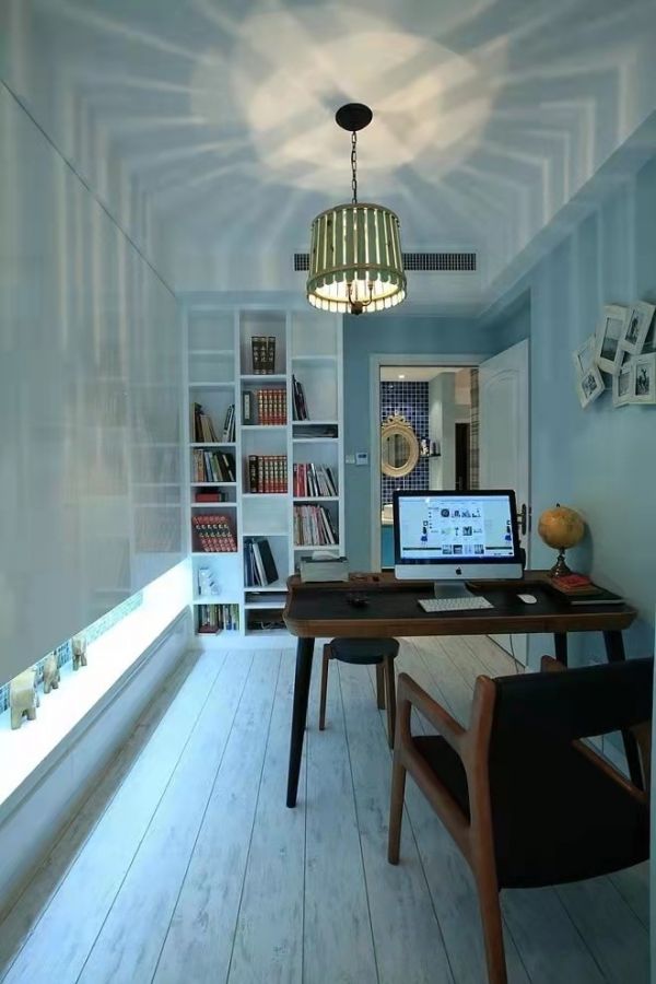 地中海風格一直是與眾不同的,藍色色調搭配淡淡的光暈,驚艷了整個書房,淺色墻體在燈筒縫隙光源的勾勒下,仿佛邁入了海底世界!當孩子邁入書房環視一周后,開心的蹦了起來!