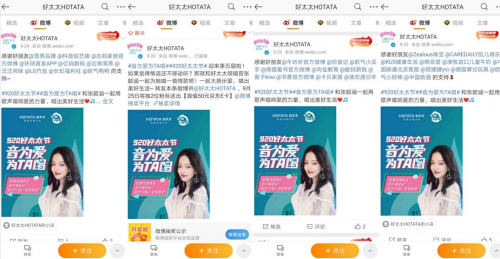 除此之外,本次好太太節(jié)在微博設(shè)立討論話題#音為愛(ài)為TA唱#,并引起了中國(guó)勁酒、歐氣小財(cái)神等近50家品牌官方號(hào)進(jìn)行轉(zhuǎn)發(fā)擴(kuò)散,得到了大量用戶及張韶涵粉絲團(tuán)的關(guān)注和討論,充分增加話題互動(dòng)量,擴(kuò)大活動(dòng)宣傳面,與好太太一起為她力量發(fā)聲。