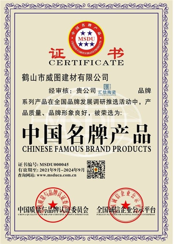 匯信陶瓷是佛山陶瓷的十大品牌之一,更是國內(nèi)陶瓷的一線品牌,憑借過硬的企業(yè)資質(zhì),匯信陶瓷榮獲中國馳名商標(biāo)、廣東省著名商標(biāo)、環(huán)保陶瓷證書、中國國家強制性產(chǎn)品認(rèn)證證書、廣東省采用國際標(biāo)準(zhǔn)產(chǎn)品認(rèn)可等多項國家認(rèn)證。多次榮登央視頻道。