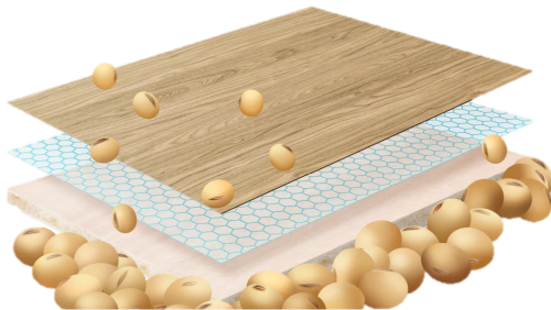 天然豆香板采用大豆蛋白膠代替普通人造板中使用的脲醛樹脂膠,游離甲醛釋放量不超過0.007mg/m3,從產品源頭做到“無醛添加”,實現健康綠色環保。物理性能上,天然豆香板板芯結構更緊密,握釘力更強,抗折抗壓強度更高,板材含水率穩定,溫水浸泡72小時不開膠。