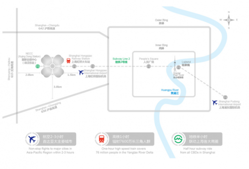 國家會展中心(上海)地處長三角核心腹地,坐落在上海虹橋商務區核心區西部,與虹橋交通樞紐直線距離僅1.5公里,通過空中連廊、地下通道及地鐵2號線與上海虹橋火車站、虹橋機場緊密相連,周邊高速路網四通八達,1至2小時可到達長三角各主要城市,航空2至3小時可直達亞太主要經濟城市。