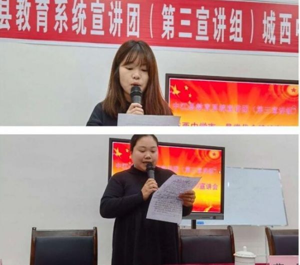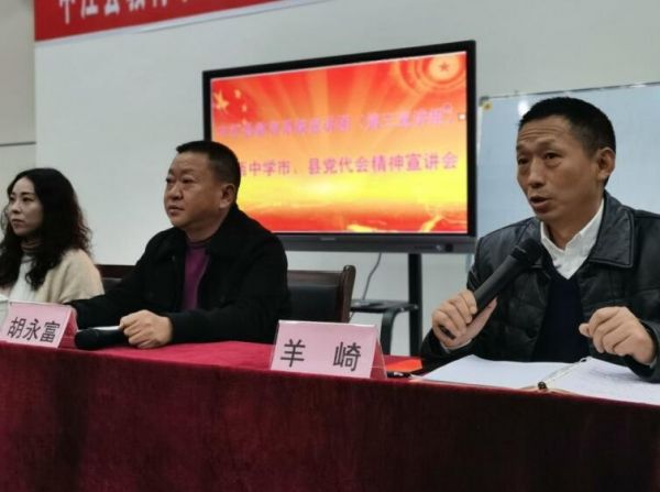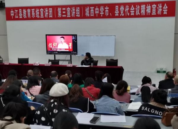 2021年10月25日下午,中江縣教育系統宣講團(第三宣講組)成員中江縣實驗中學黨總支書記、校長胡永富同志,教育局工會副主席曹陽同志蒞臨城西中學,對市、縣黨代會精神進行宣講。會議由城西中學黨總支書記、校長羊崎同志主持,城西中學全體教師參與了此次會議。