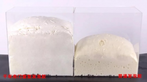 首先,千年舟門窗型發泡膠采用前發泡技術,發泡劑的膨脹率達到70%-90%,而普通發泡膠的膨脹率在40%-60%,我們發泡膠的膨脹率約是普通發泡膠的2倍(見圖一),甚至更多。這就相當于你花了一份錢買了接近兩份普通發泡膠的量,既節約了成本,質量上還有保障。千年舟發泡膠的韌性非常好,產品性能穩定,抗壓抗收縮性好,為你減少了發泡膠使用時間過長而出現收縮、變形而導致門窗滲水的問題。而且在加工的時候,不同于普通發泡膠要等個大半天才能固化加工,千年舟發泡膠可以做到快速固化(約10min),30min就可以切割加工,非常方便。