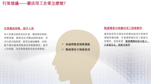 劉樹兵建議,行業加強勞動者保障建設是大勢所趨,對于平臺企業,更重要的是甄選優質合規服務商來協助解決靈活就業工作者的權益保障問題。具體而言,平臺企業需加大對靈活就業者的社保、職業傷害保障、勞動保護、職業成長等權益保障建設,這也符合行業合規經營、監管加強的趨勢;同時,提升靈活就業勞動者的勞動積極性、提升人員效能,為企業創造更多產出與價值。而隨著監管對合規要求持續加強及企業競爭環境持續加劇,企業選擇靈活用工服務合作伙伴需要從價格因素導向逐步轉變到服務機構的綜合能力導向,包括IT系統安全、稅務合規等綜合服務能力,以此增強自身的綜合競爭力。
