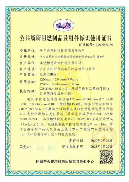 千年舟難燃OSB板通過國家防火建筑材料質量監督檢驗中心檢測,獲得公共場所阻燃制品及組件標識使用證書,符合國標GB 8624-2012標準B1(c-s2,d0,t1)級要求,單體燃燒、可燃性、煙氣毒性等級檢測均合格。