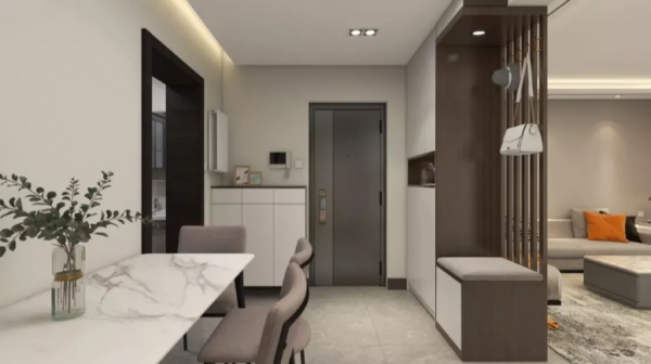讓我們來看一下。首先,玄關的“功能性”體現在了兩個方面,一是分區,定制柜+實木鞋凳+柵欄衣架對客廳形成隔斷,增加了玄關的狹長感、儀式感;另一方面,由于玄關區與餐廳、廚房相互銜接較為緊密,此處多重組合的置物柜強大的收納能力,也保證了三個空間的整潔與美觀。