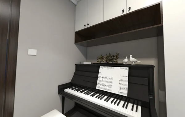 書房與鋼琴間進行了一體化設計,居住者無論是工作、學習還是練琴,都可以享有更安靜和私密的空間。書房中的書柜也設計為封閉與開放相結合的方式,美觀的同時,也有利于物品、書籍的收納和取用。