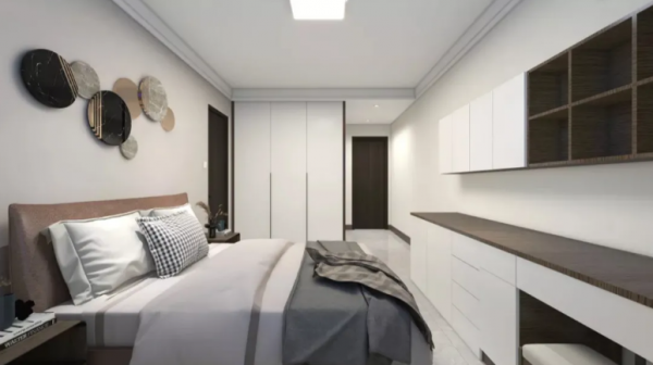 主臥也有一處設計亮點,兼具工作臺、梳妝臺、置物臺一體三用功能的“加長柜臺”,假設居住者夫妻一方或孩子在使用書房,另一方也需要工作的話,這個“加長柜臺”就能完美發揮效用。