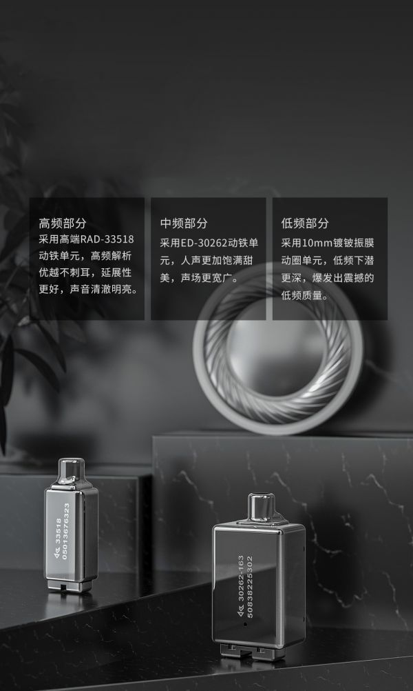 一圈兩鐵三單元圈鐵耳機(jī)。高頻部分,采用高端RAD-33518動(dòng)鐵單元,高頻解析優(yōu)越不刺耳,延展性更好,聲音清澈明亮。中頻部分,采用ED-30262動(dòng)鐵單元,人聲更加飽滿甜美,聲場(chǎng)更寬廣。低頻部分,采用10mm鈹振膜動(dòng)圈單元,低頻下潛更深,爆發(fā)出震撼的低頻質(zhì)量。