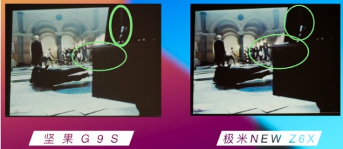 從實測對比圖中可以看出,堅果G9S在畫面暗部上處理得更加精細,最直觀的可以看圈起來的鋼琴立柱和漆面部分,極米的立柱已經完全看不清晰,與大面積的黑色融為一體,而堅果G9S的還有清晰且有層次感的完整輪廓。漆面上,極米NEW Z6X的同樣是一片漆黑,而堅果G9S這邊,還有漸變與頂端光澤交織的類金屬質感。這就是先進的MT9669芯片帶來的更加優秀的HDR色彩解析能力。