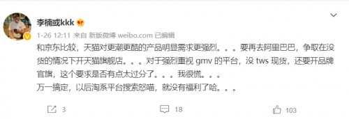 除了上線聯(lián)名禮盒,1月26日,怒喵科技 Angry Miao 創(chuàng)始人李楠便在微博宣布決定選擇在天貓開怒喵科技官方旗艦店,雖然怒喵即將發(fā)布的 TWS 產(chǎn)品沒有現(xiàn)貨,但為了方便未來 TWS 產(chǎn)品的大貨發(fā)售,還是需要通過先開設(shè)旗艦店以作儲備。