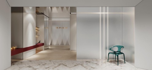 首先,打開門是一個(gè)展示門廳玄關(guān)鞋柜產(chǎn)品U字型的門廳空間,同材質(zhì)的護(hù)墻板及不銹鋼收口,讓整個(gè)空間圍合感超強(qiáng)——高光沙棕色的六面烤漆材質(zhì),結(jié)合具有親膚感的德國雷諾麗特新款裝飾膜,顏色非常柔和。而玄關(guān)處代表瑪婭品牌“M”字樣的創(chuàng)意鏡像設(shè)計(jì),多層次疊加交相呼應(yīng),形成了瑪婭獨(dú)特的品牌壁壘。