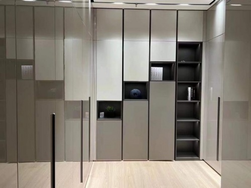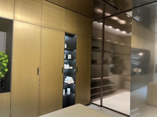 無獨(dú)有偶,新展館護(hù)墻系統(tǒng)使用了新出的薄鋁層板,其橫向分隔的德國雷諾麗特環(huán)保裝飾膜與抽屜面板材質(zhì)相得益彰,經(jīng)典尊啞沙漠灰色的選用,也讓空間更有層次感。玄關(guān)側(cè)邊的鋁框玻璃展示柜別出心裁,用女性親昧的玫瑰金色鋁框,搭配玫瑰金玻璃門板,符合潮流,也讓整面柜的視覺沖擊力更強(qiáng)。