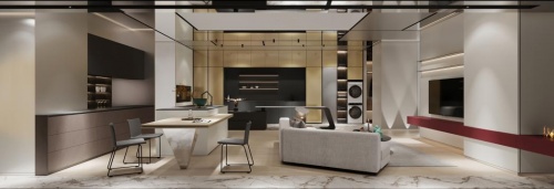 往右是含有衣護(hù)和洗護(hù)空間的功能高柜。獨(dú)特的口袋門設(shè)計(jì)把衣護(hù)理機(jī)及洗干衣機(jī)藏在其中,這套柜子最大的亮點(diǎn)便是門板。區(qū)別于市場上的金屬烤漆門板,瑪婭采用了德國全進(jìn)口、全手工打造的藝術(shù)金屬烤漆——每塊門板呈現(xiàn)的肌理都不一樣,黃銅金色的六面烤漆工藝,也是烤漆界的天花板了。西廚中島搭接了一個(gè)圓弧型桌子,桌面整體以金、黑、白3色搭配,彰顯高端大氣。