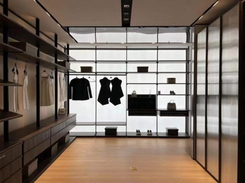 再往里走,后區(qū)是一個(gè)夜晚系統(tǒng)的衣帽間,這是德國瑪婭全新的開放式航天骨架系統(tǒng),展示性非常強(qiáng),燈光光感非常柔和,在夜晚無燈光條件下,展示效果更佳!在衣帽間背面,是一組玻璃展示柜,全新的FG-507B鋁框玻璃,是一款有隱約光感的小燈芯玻璃,這里可以隨心所欲放些換季衣服。