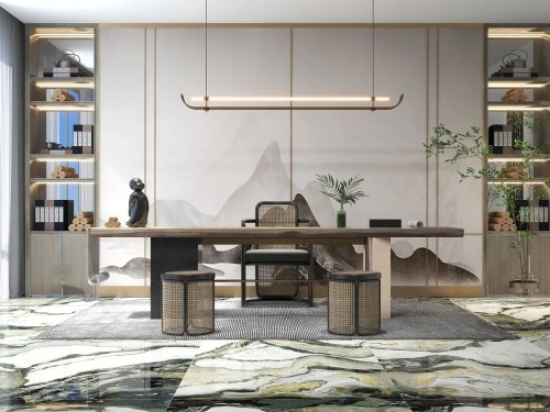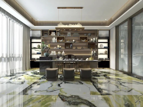 鋪貼在書房地面,博德瓷磚水墨丹青潑墨綠的紋理隨意流動,起起伏伏。如荷花般的水墨紋理,彰顯“出淤泥而不染,濯清漣而不妖”的高潔品質(zhì),營造古色古香的書香環(huán)境。