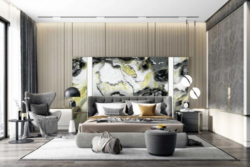 應(yīng)用在臥室墻面,水墨丹青相對較低的色調(diào)飽和度,帶一些淺綠色調(diào),氣質(zhì)柔和。讓居者坐擁青山綠水,感受自然的呼吸,享受春天的勃勃生機。放飛綠意的心情,一切盡在“水墨丹青”。