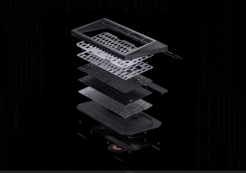 在手感提升方面,Angry Miao 大膽地嘗試了透光一體式 Gasket 結構方式。在 PC 材質的鍵盤上實現了 Gasket Mount,除了保障基本的敲擊體驗外,內部材料的質感、觀感也更為講究。