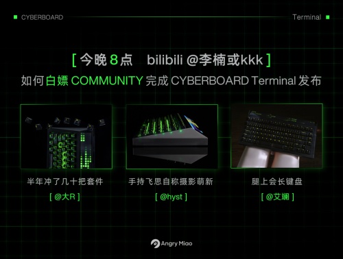 2022年4月27日,怒喵科技 (Angry Miao) 正式發布了客制化機械鍵盤新品 CYBERBORAD Terminal,該產品靈感源自 Terminal ,同時首創性地采用了透光一體式  Gasket Mount,套件官方統一零售價為¥3799,成品套裝(有刻/無刻)¥5099。